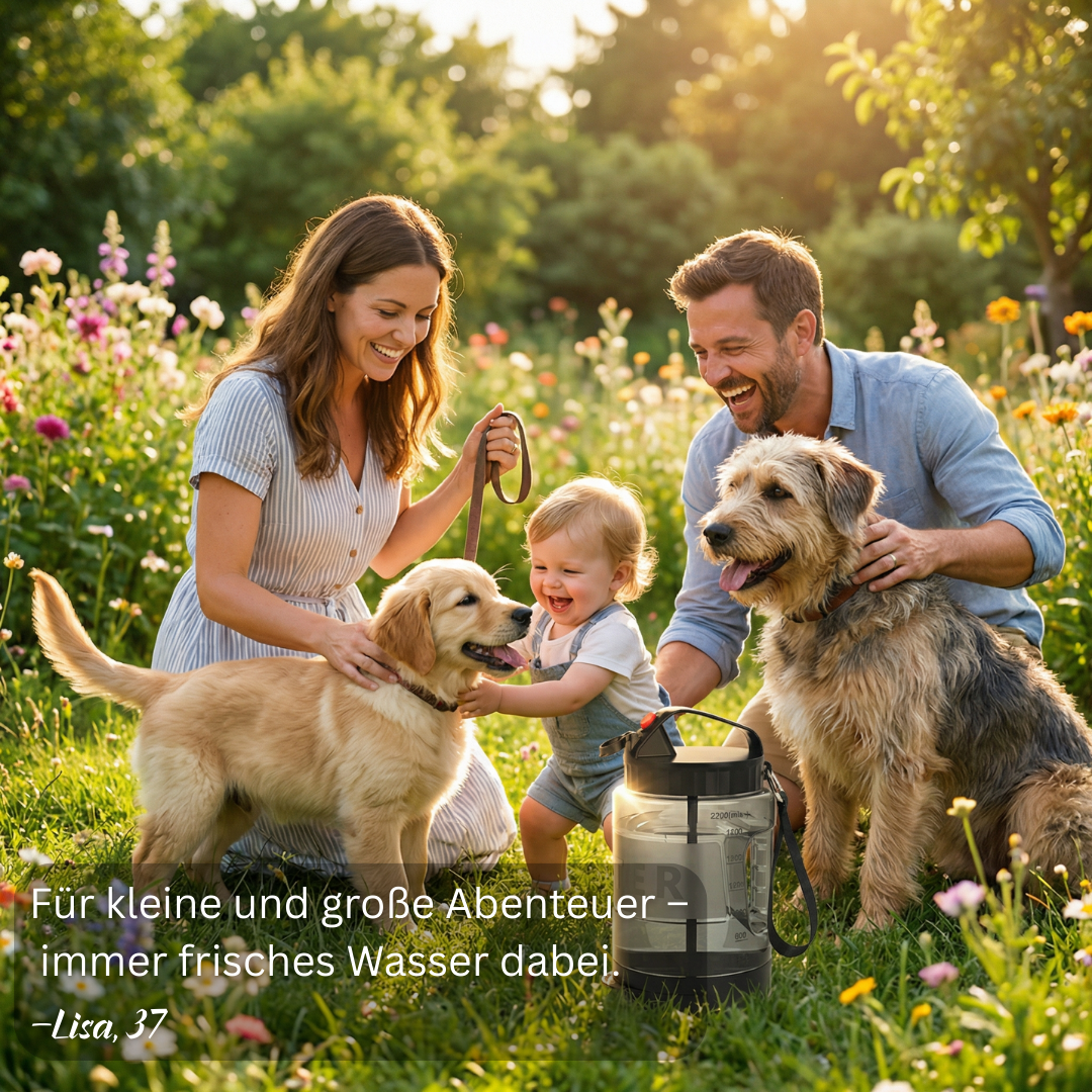 „Endlich eine Trinkflasche, die unterwegs wirklich funktioniert.Kein Auslaufen, einfache Bedienung und mein Hund trinkt problemlos daraus.Nutzen wir regelmäßig im Auto und beim Spazierengehen.“