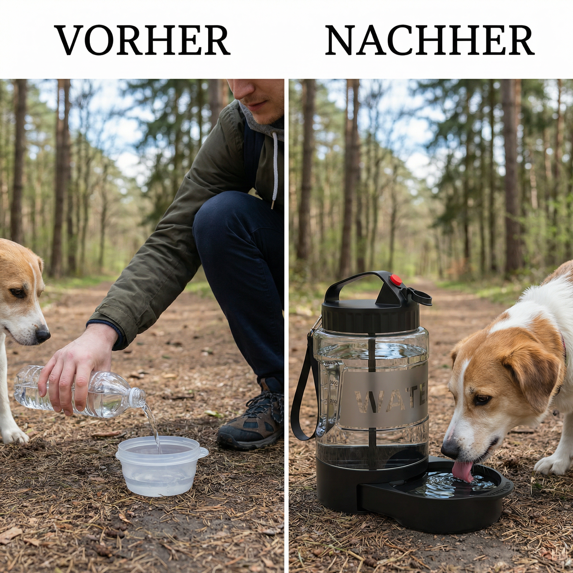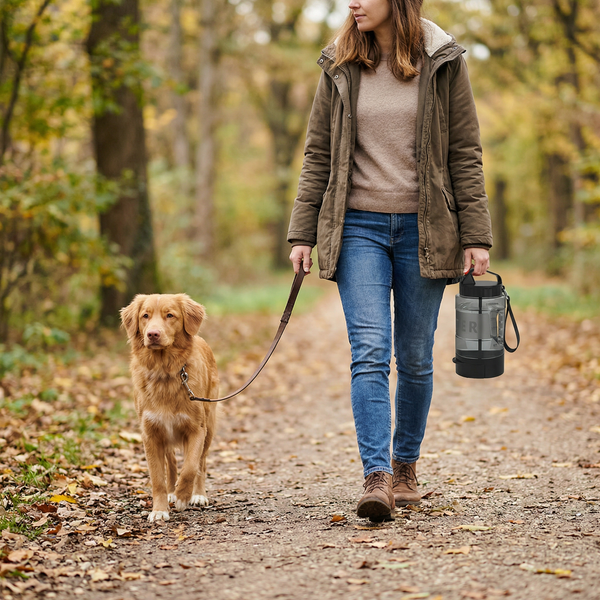 Mit deiner tragbaren PfotenPause™ hast du immer eine frische Wasserquelle dabei. Ideal für lange Spaziergänge oder Ausflüge, um deinen Hund jederzeit hydratisiert zu halten und ihm mehr Energie zu geben.